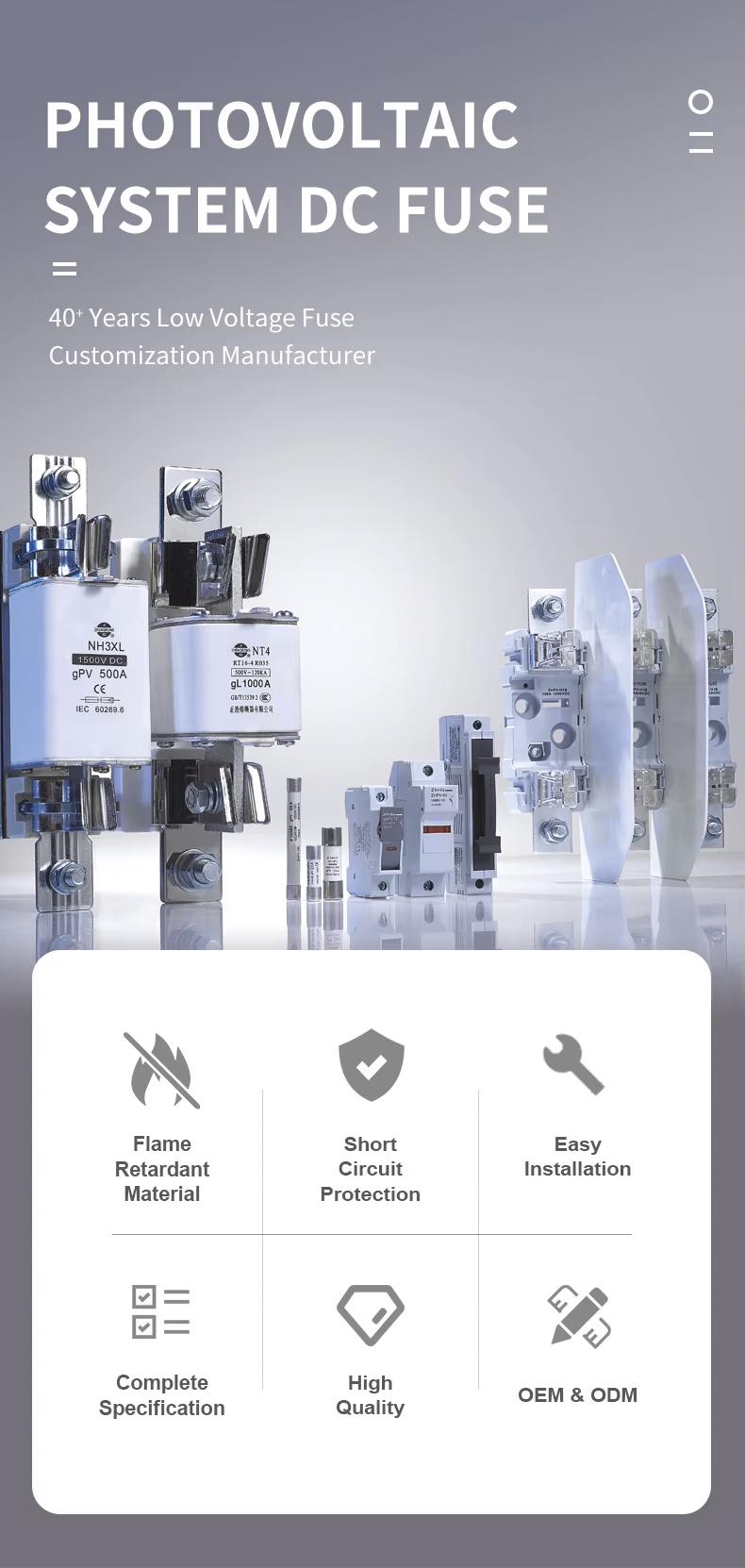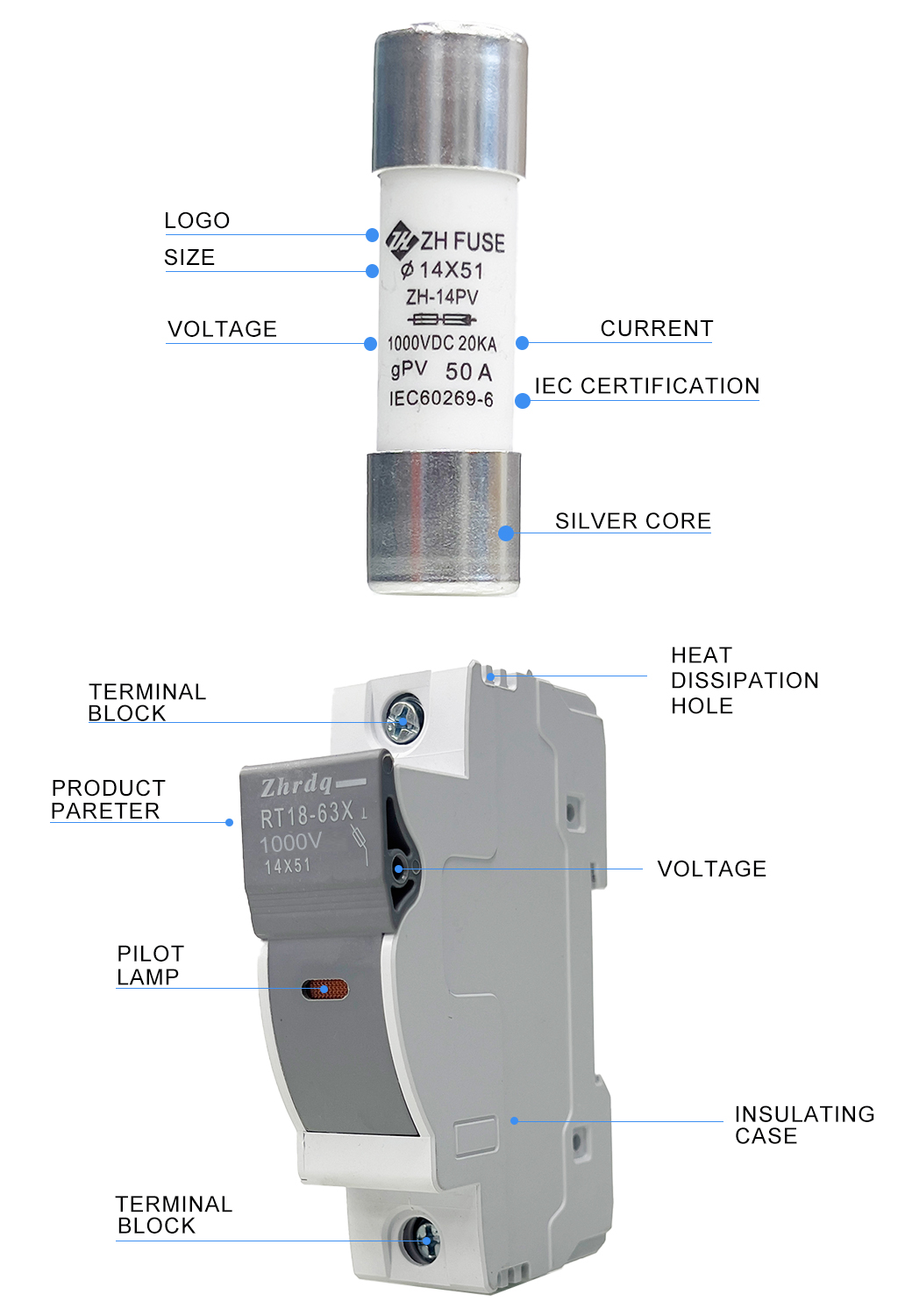 ZHENGRONG е кинеска компанија која е специјализирана за производство и производство на осигурувачот ZHPV-63 14X51 цилиндричен gG, кој е специјално дизајниран за заштита со брзо дејство од струи на краток спој и струи на преоптоварување кои вообичаено се среќаваат во индустриски апликации. големината на врската, што го прави идеален за заштита на општите индустриски кола кои работат до 1000 V како што се мотори, трансформатори, нисконапонска дистрибуција и контролни кола. Држачот за осигурувачи кој е компатибилен со цилиндричниот gG осигурувач ZHPV-63 14x51mm е држач за осигурувачи ZHPV-63 14x51mm, кој се одликува со обвивка отпорна на пламен што ги исполнува V0 стандардот и мртов преден дизајн за безбедна за прстите. магистрална лента и е достапна во 1P/2P/3P/4P конфигурации за да се приспособат на различни барања за инсталација.